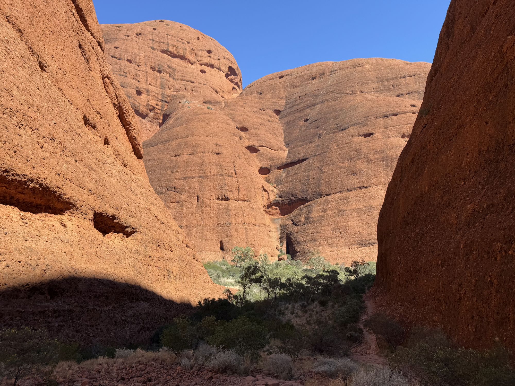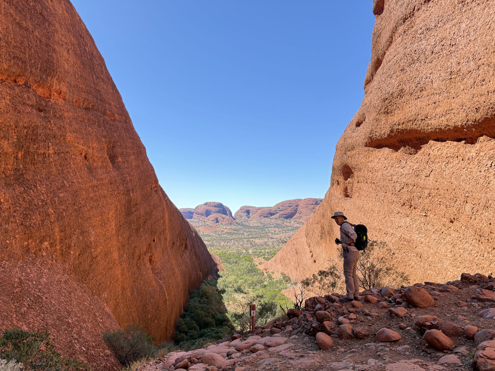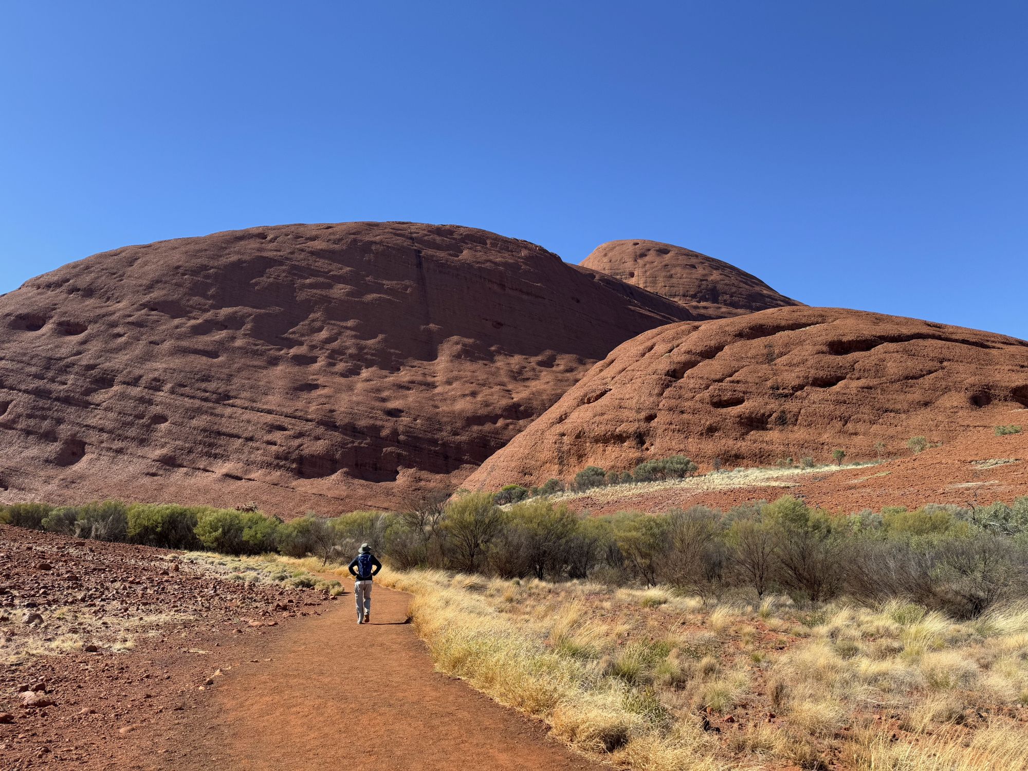 Nachdem nochmals ein kühler Tag vorhergesagt ist, wollen wir ihn für eine Wanderung in den 40 km entfernten Olgas (Kata Tjuta) nutzen. Wir fahren bei Sonnenaufgang los und stoppen am Kata Tjuta Sunrise Viewing Point, der einen guten Überblick bietet. Frühstück gibt es dann an einem Viewing Point. Um halb neun sind wir auf dem Trail. Auch diese Wanderung ist spektakulär schön!