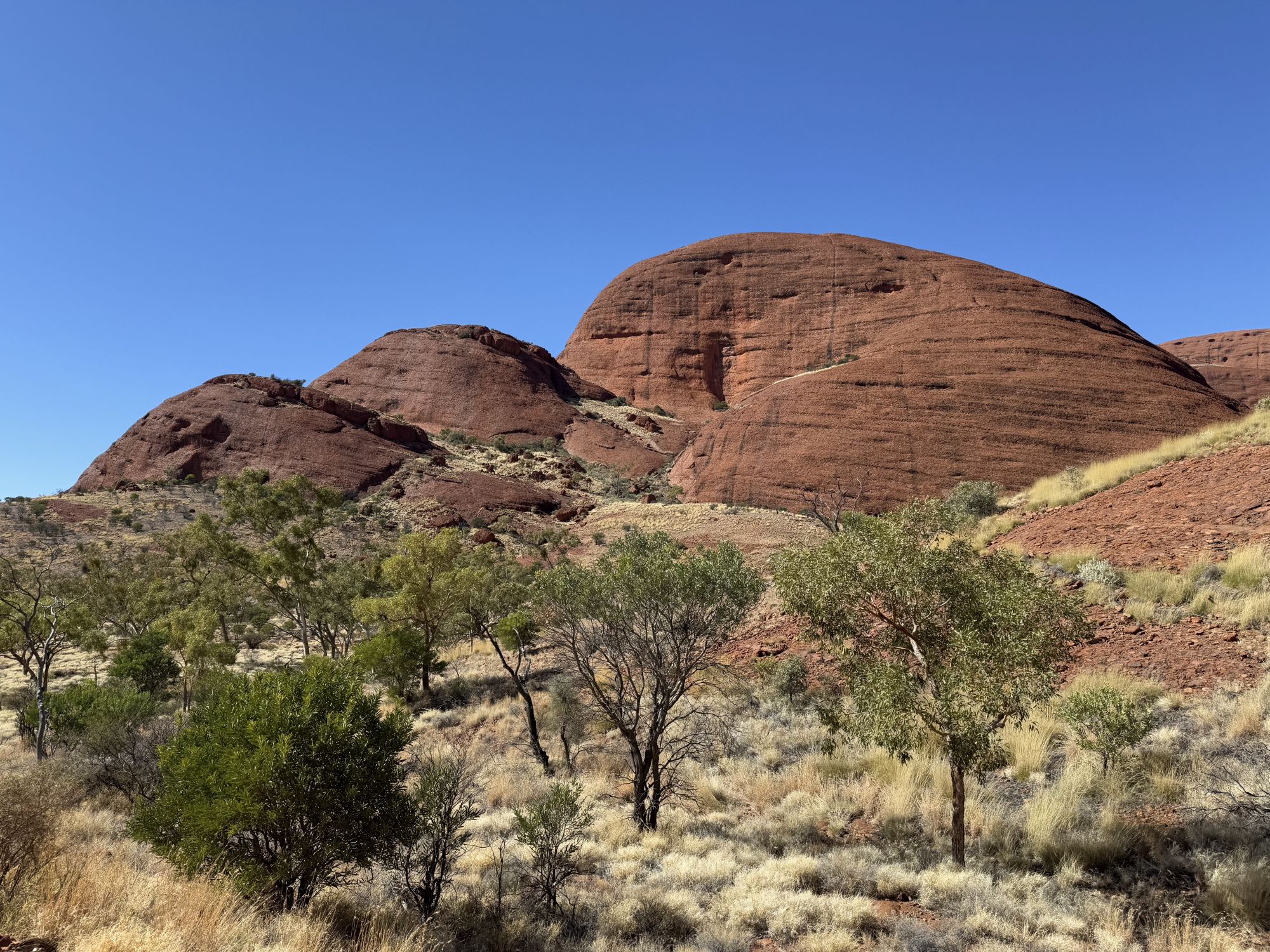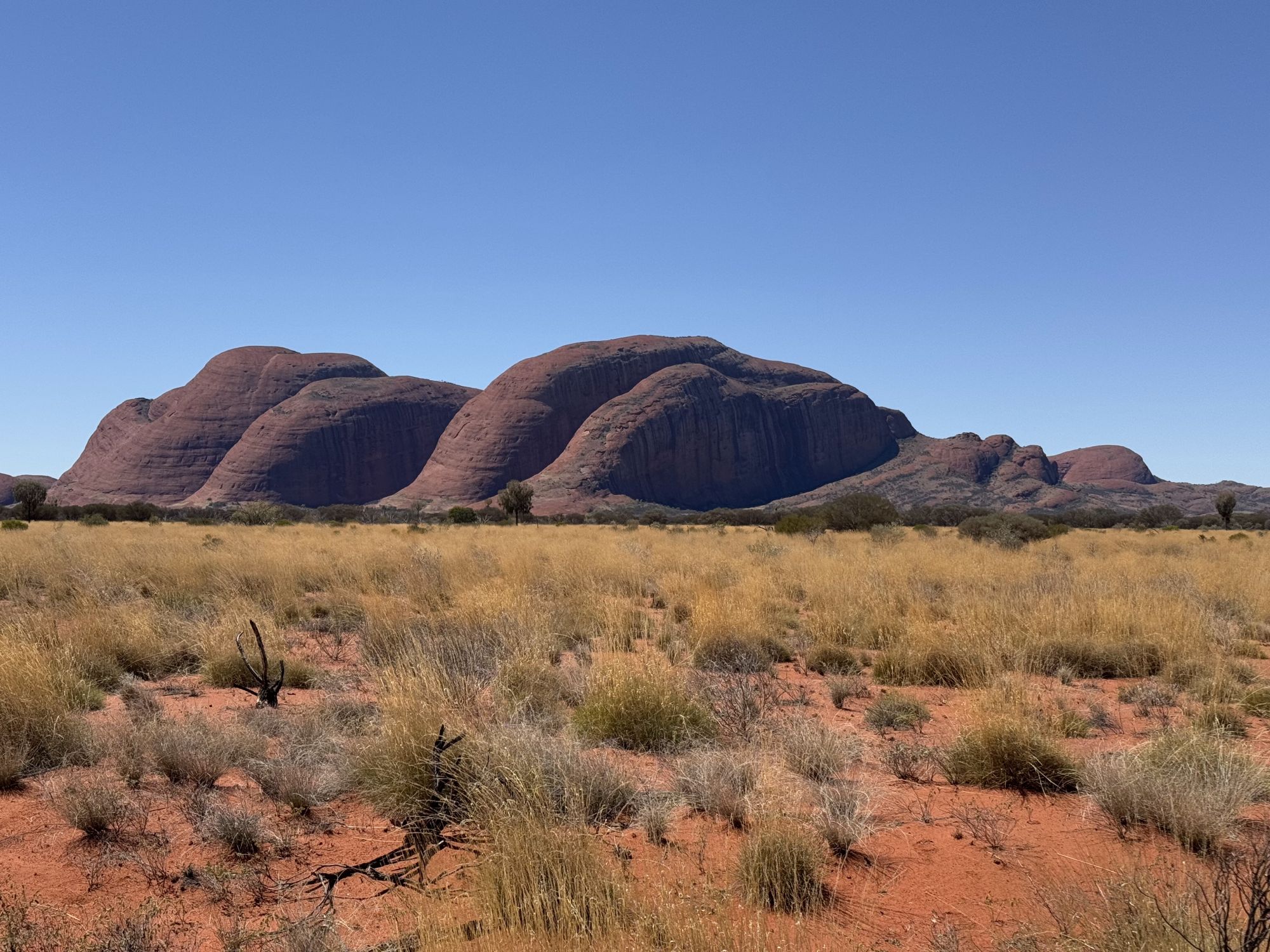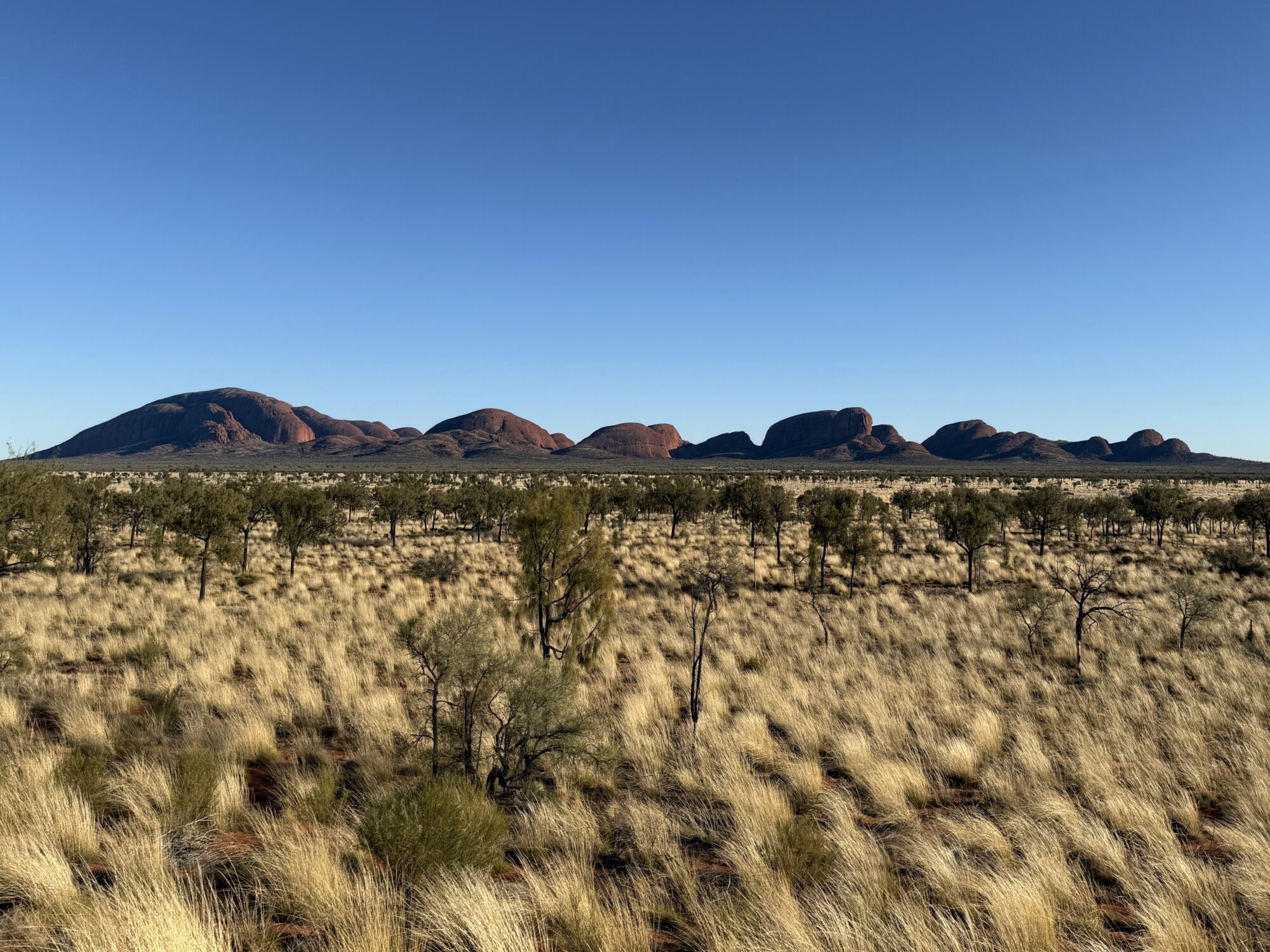 Nachdem nochmals ein kühler Tag vorhergesagt ist, wollen wir ihn für eine Wanderung in den 40 km entfernten Olgas (Kata Tjuta) nutzen. Wir fahren bei Sonnenaufgang los und stoppen am Kata Tjuta Sunrise Viewing Point, der einen guten Überblick bietet. Frühstück gibt es dann an einem Viewing Point. Um halb neun sind wir auf dem Trail. Auch diese Wanderung ist spektakulär schön!