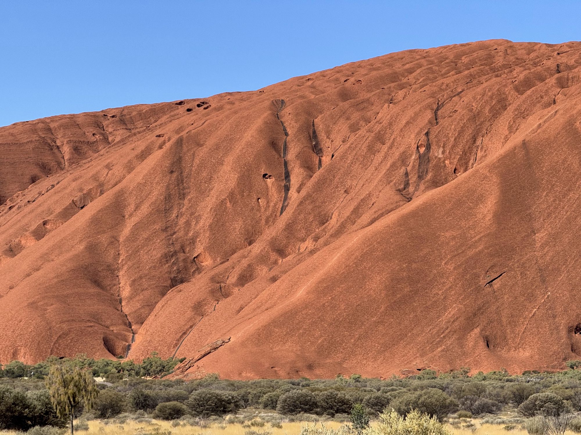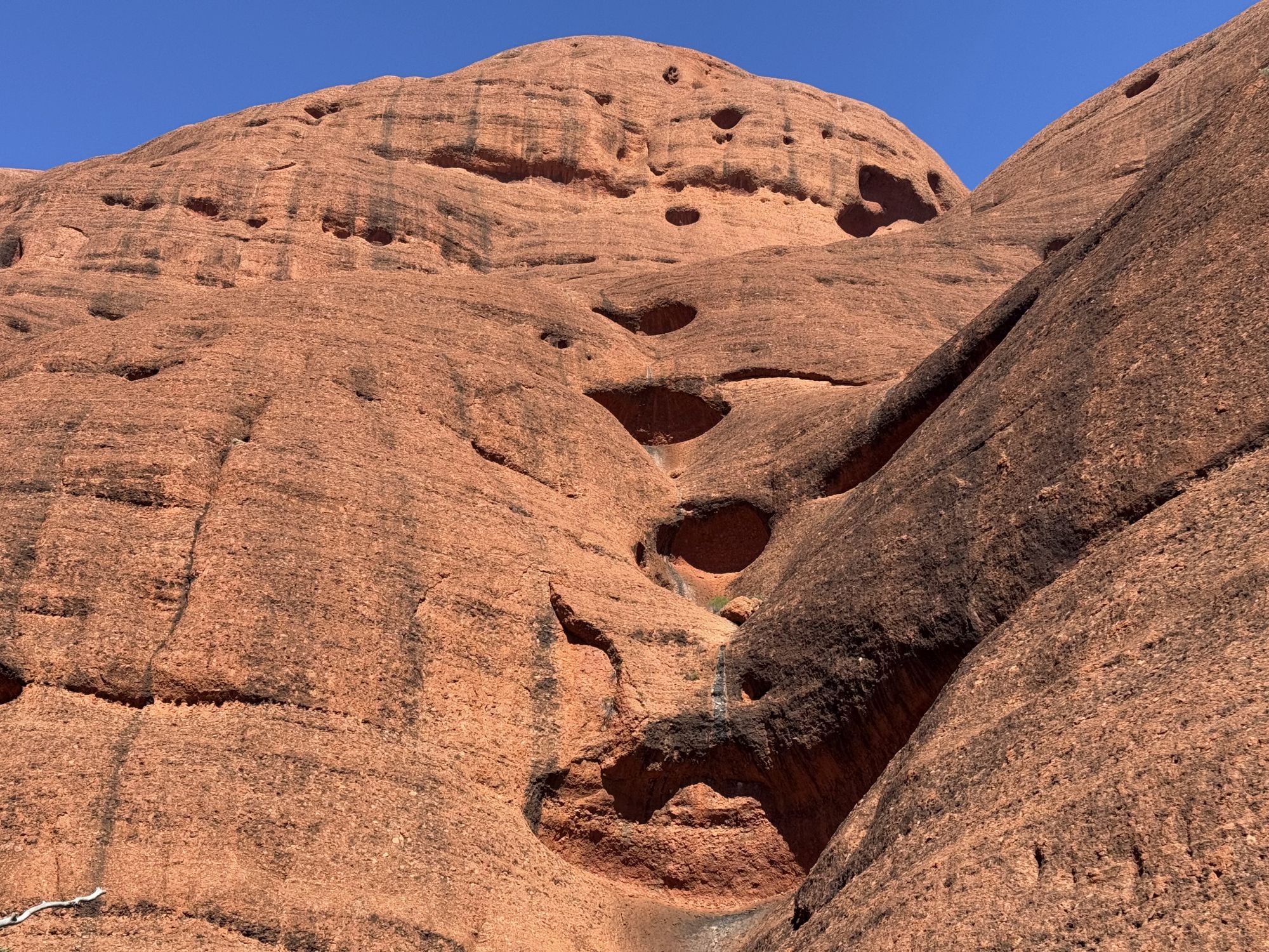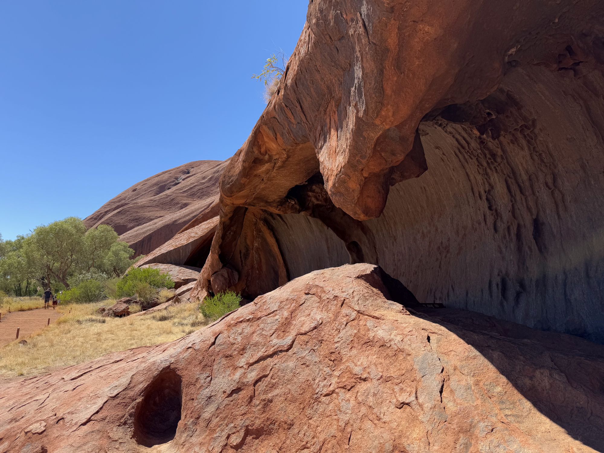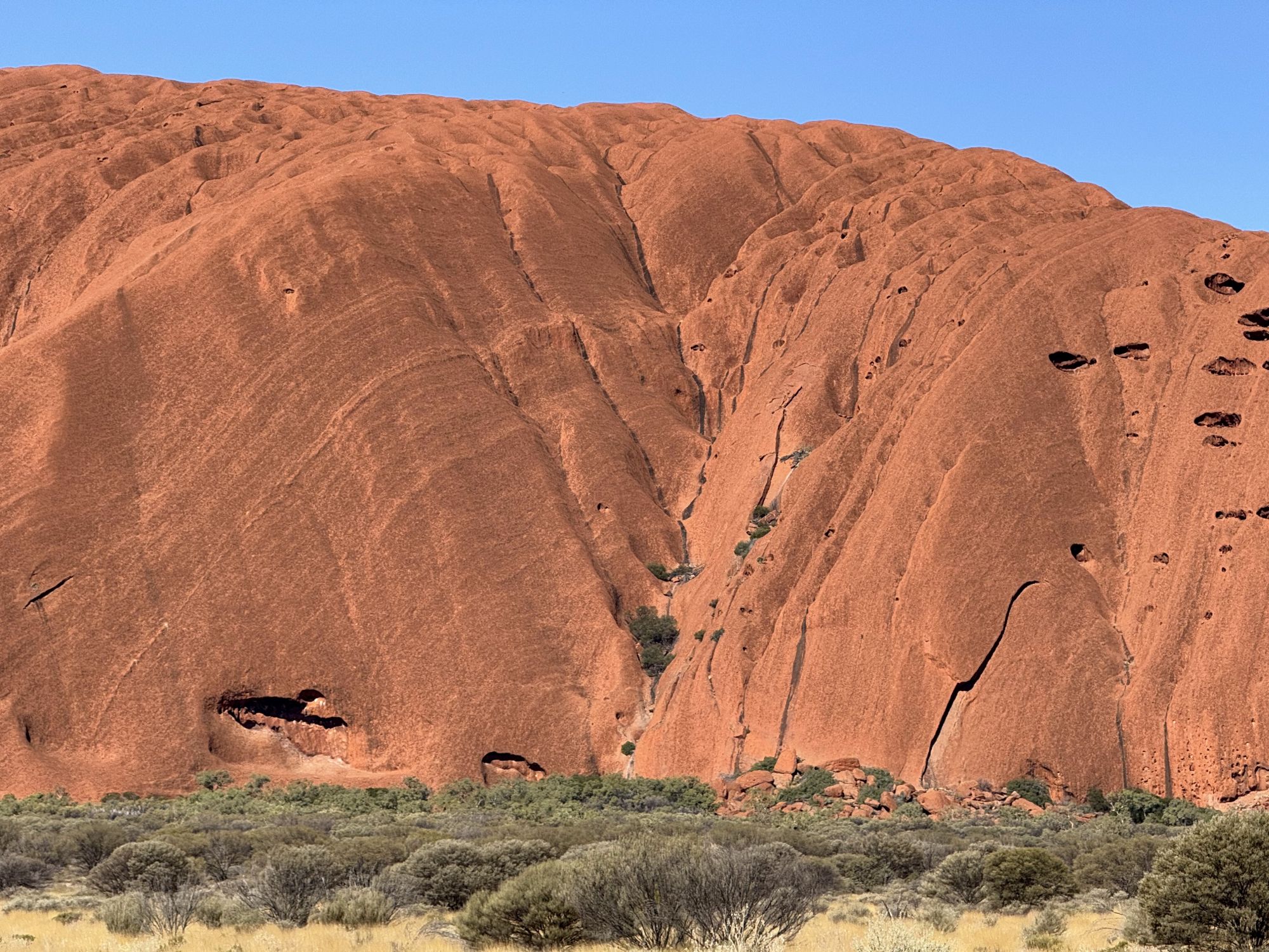 Für den letzten Tag am Uluru haben wir uns Fahrräder gemietet, denn heute soll es deutlich wärmer werden und die Umrundung zu Fuß erscheint uns der Sonne zu ausgesetzt. Wir radeln vom Cultural Center los und umrunden den Berg im Gegenuhrzeigersinn. Mit vielen Zwischenstopps brauchen wir doch drei Stunden. Besonders eindrucksvoll ist das Mutijulu Waterhole und Kantju Gorge. Die gesamte Nordseite des Berges ist heiliges Terrain, hier verläuft der Weg weit weg vom Berg und zudem ist das Fotografieren verboten. Anschauen darf man die Linien und Höhlen am Berg zwar schon, aber nur vor Ort und nicht, wie es auf Bildern der Fall wäre, an anderen Orten. Leider sind gerade hier die Strukturen besonders interessant anzusehen.