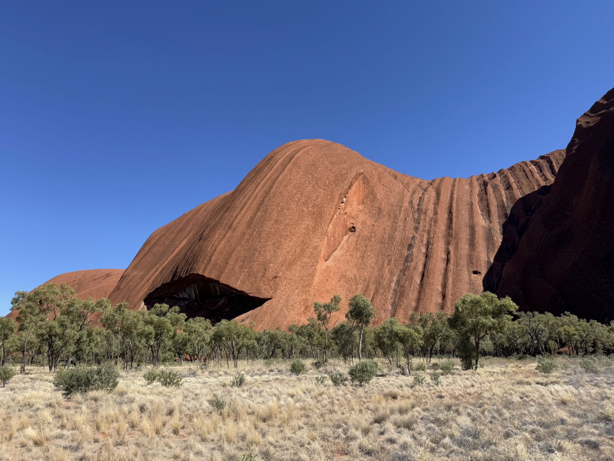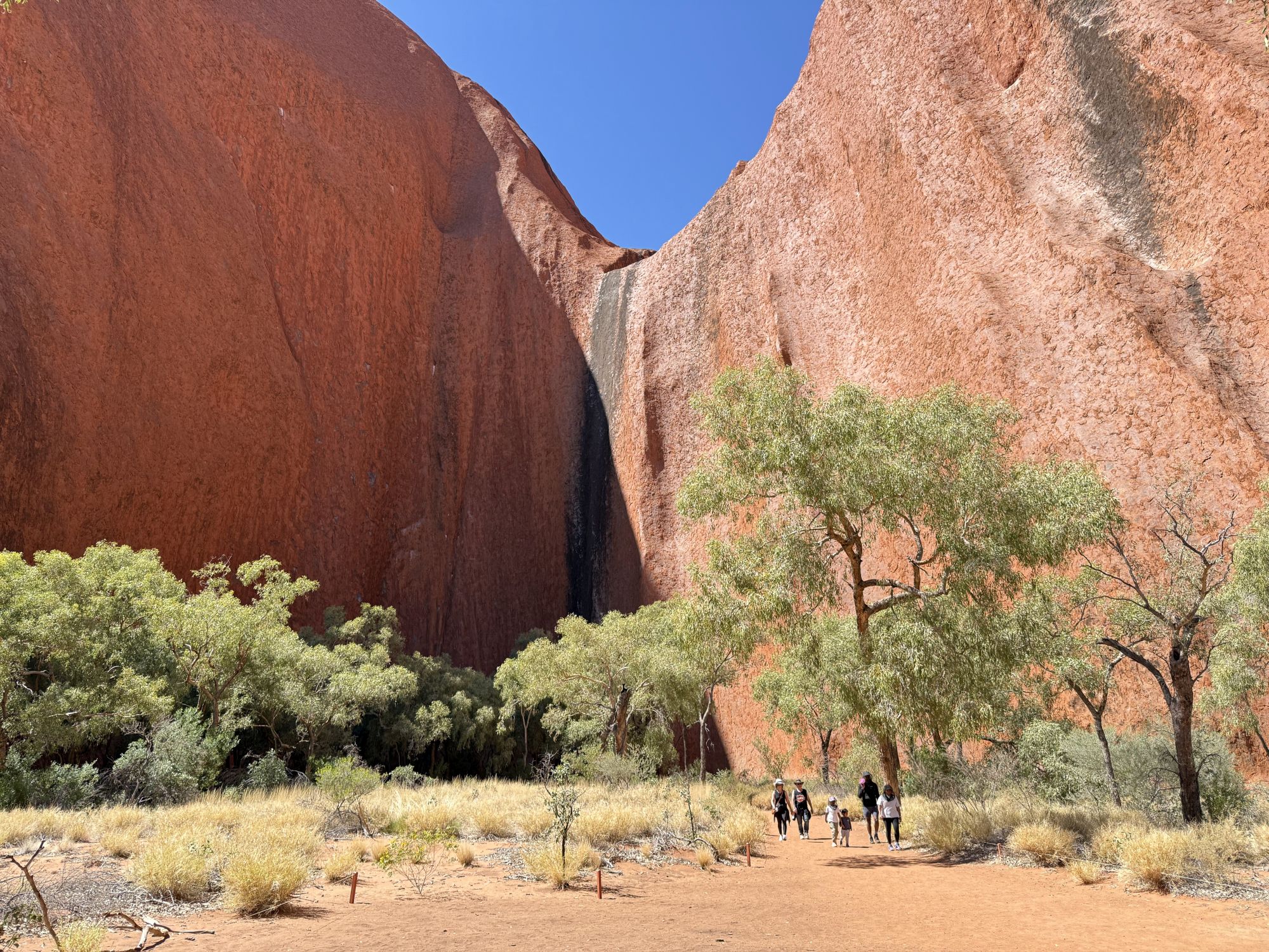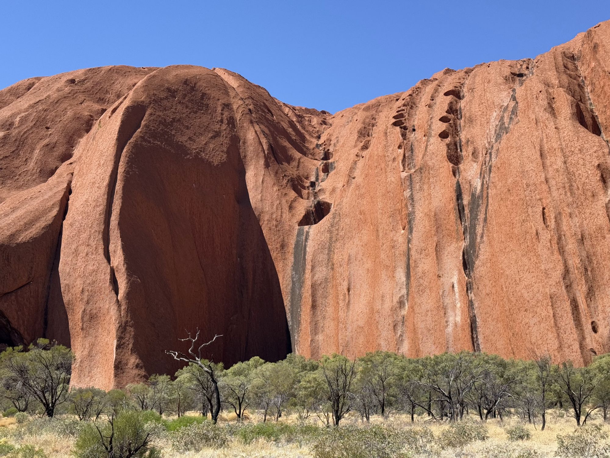 Für den letzten Tag am Uluru haben wir uns Fahrräder gemietet, denn heute soll es deutlich wärmer werden und die Umrundung zu Fuß erscheint uns der Sonne zu ausgesetzt. Wir radeln vom Cultural Center los und umrunden den Berg im Gegenuhrzeigersinn. Mit vielen Zwischenstopps brauchen wir doch drei Stunden. Besonders eindrucksvoll ist das Mutijulu Waterhole und Kantju Gorge. Die gesamte Nordseite des Berges ist heiliges Terrain, hier verläuft der Weg weit weg vom Berg und zudem ist das Fotografieren verboten. Anschauen darf man die Linien und Höhlen am Berg zwar schon, aber nur vor Ort und nicht, wie es auf Bildern der Fall wäre, an anderen Orten. Leider sind gerade hier die Strukturen besonders interessant anzusehen.