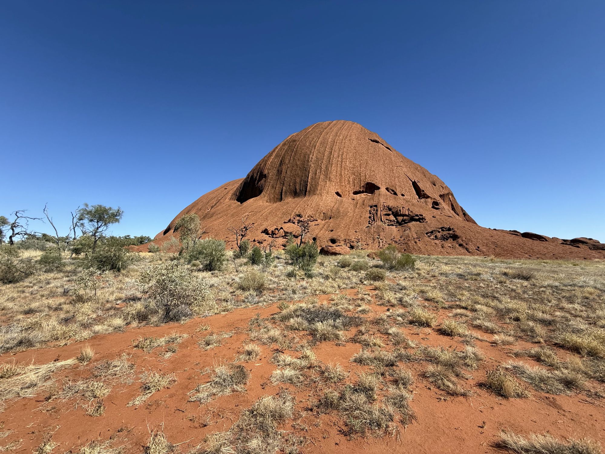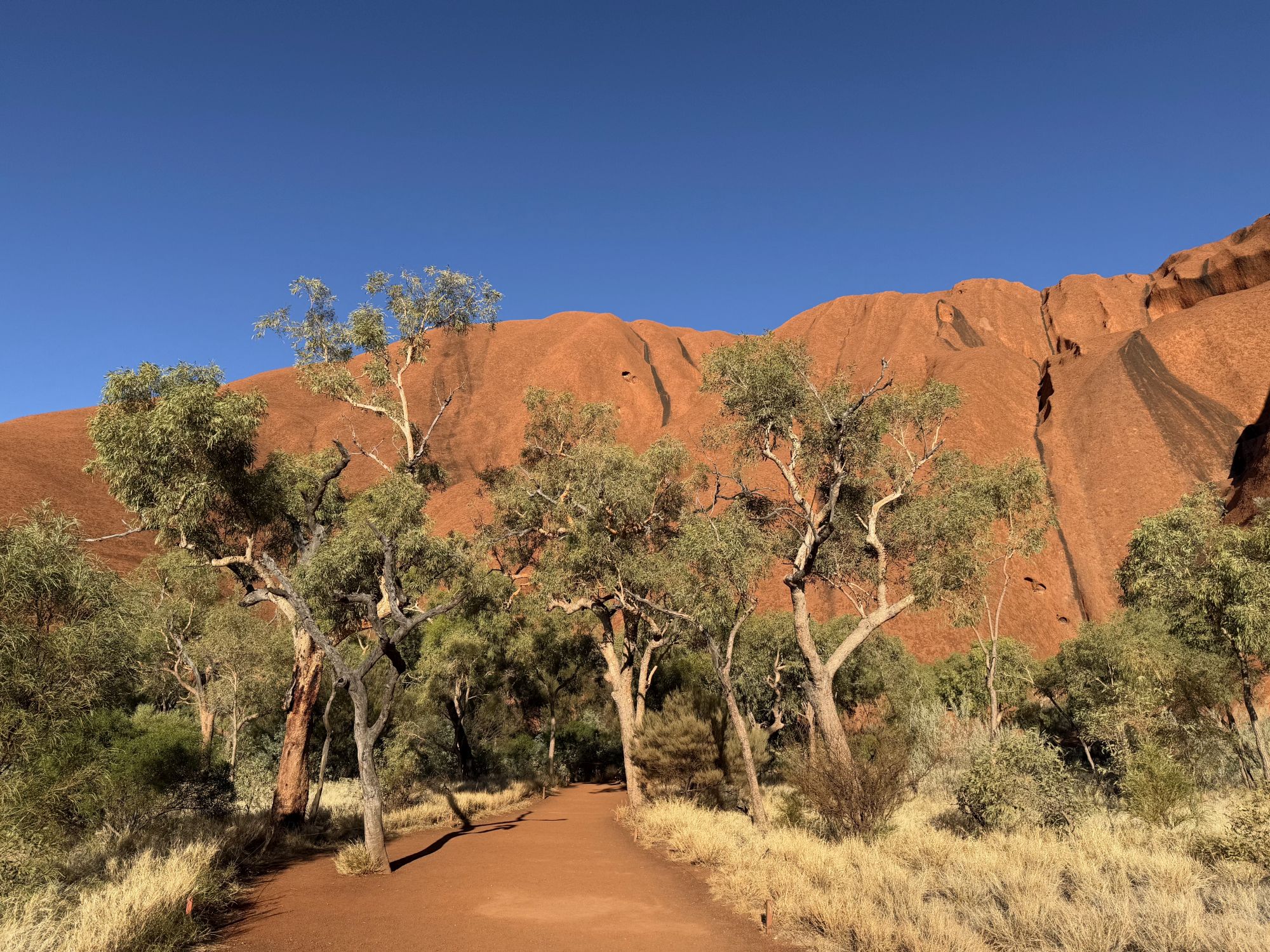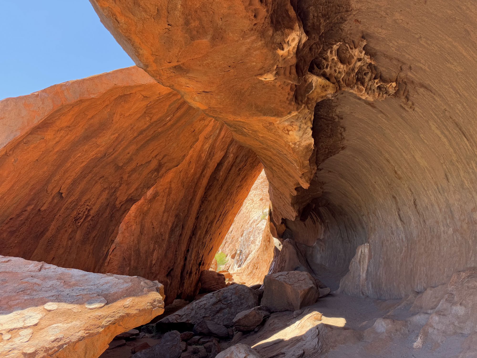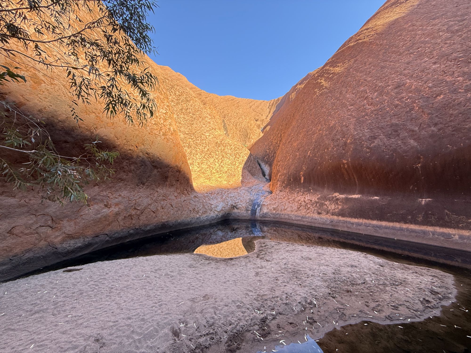 Für den letzten Tag am Uluru haben wir uns Fahrräder gemietet, denn heute soll es deutlich wärmer werden und die Umrundung zu Fuß erscheint uns der Sonne zu ausgesetzt. Wir radeln vom Cultural Center los und umrunden den Berg im Gegenuhrzeigersinn. Mit vielen Zwischenstopps brauchen wir doch drei Stunden. Besonders eindrucksvoll ist das Mutijulu Waterhole und Kantju Gorge. Die gesamte Nordseite des Berges ist heiliges Terrain, hier verläuft der Weg weit weg vom Berg und zudem ist das Fotografieren verboten. Anschauen darf man die Linien und Höhlen am Berg zwar schon, aber nur vor Ort und nicht, wie es auf Bildern der Fall wäre, an anderen Orten. Leider sind gerade hier die Strukturen besonders interessant anzusehen.
