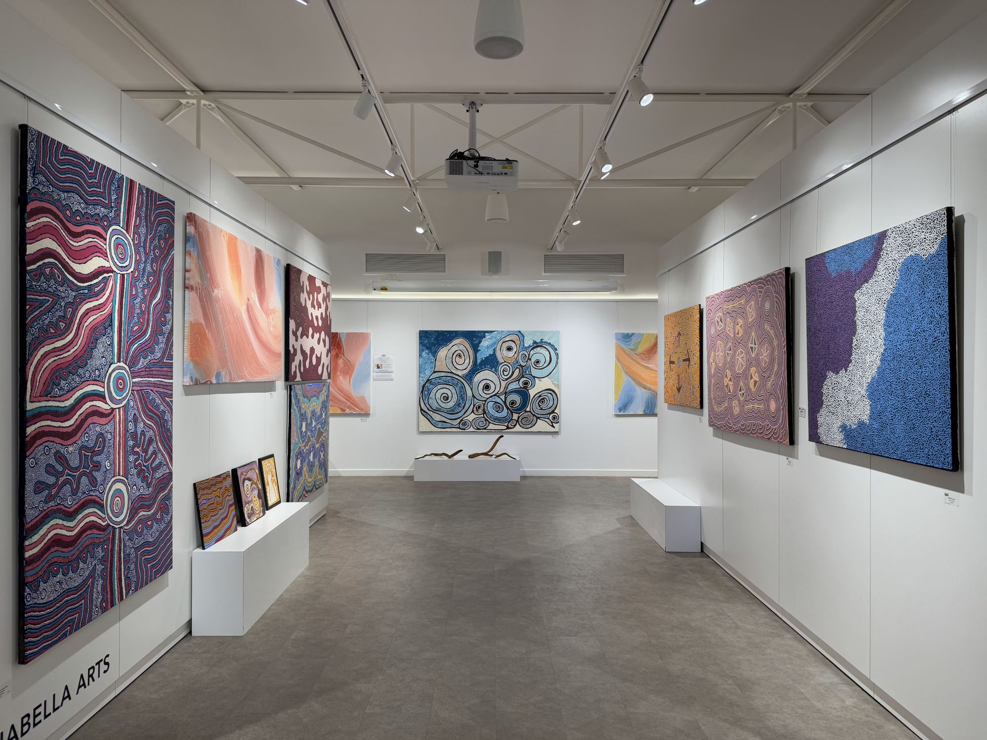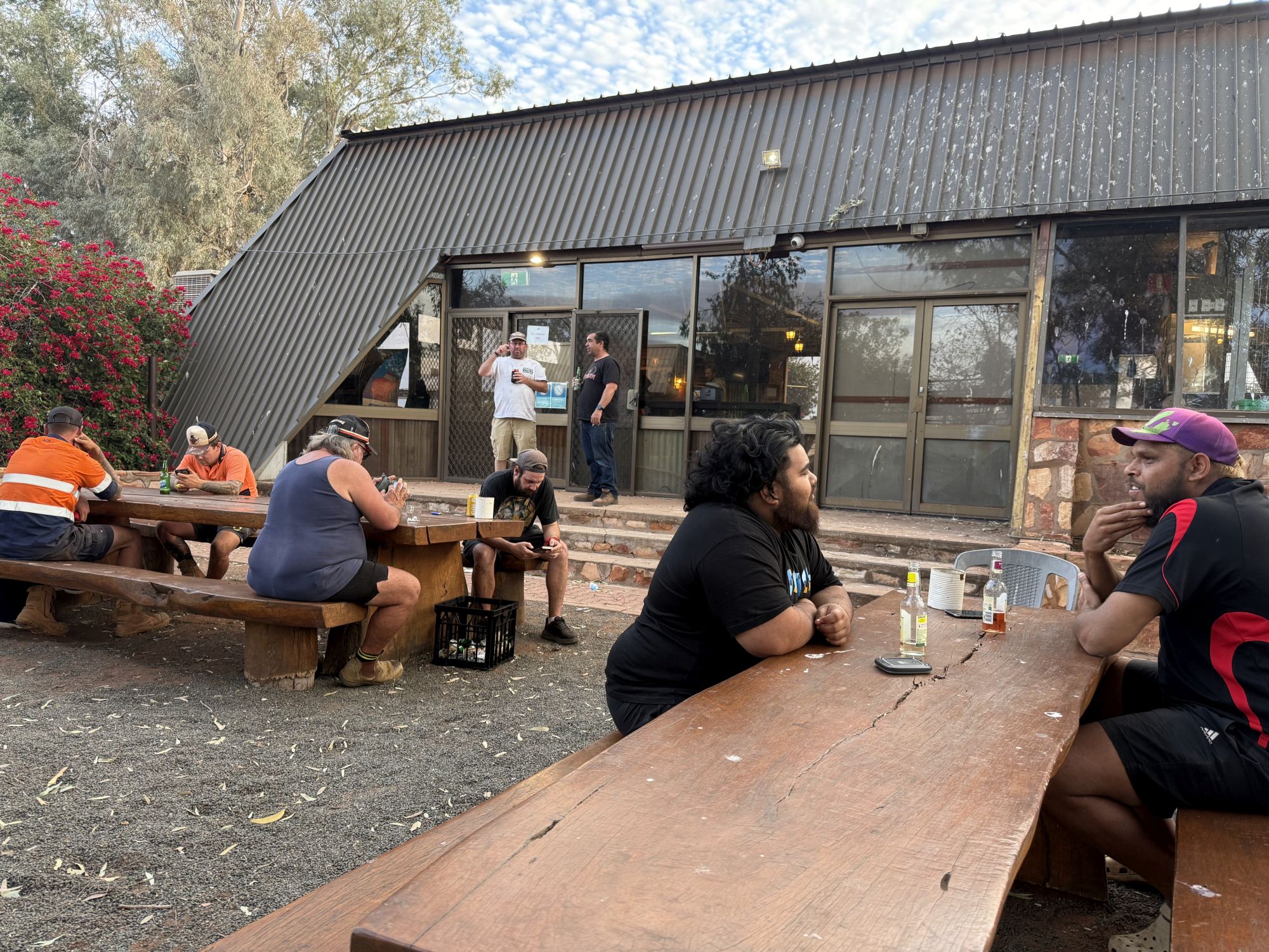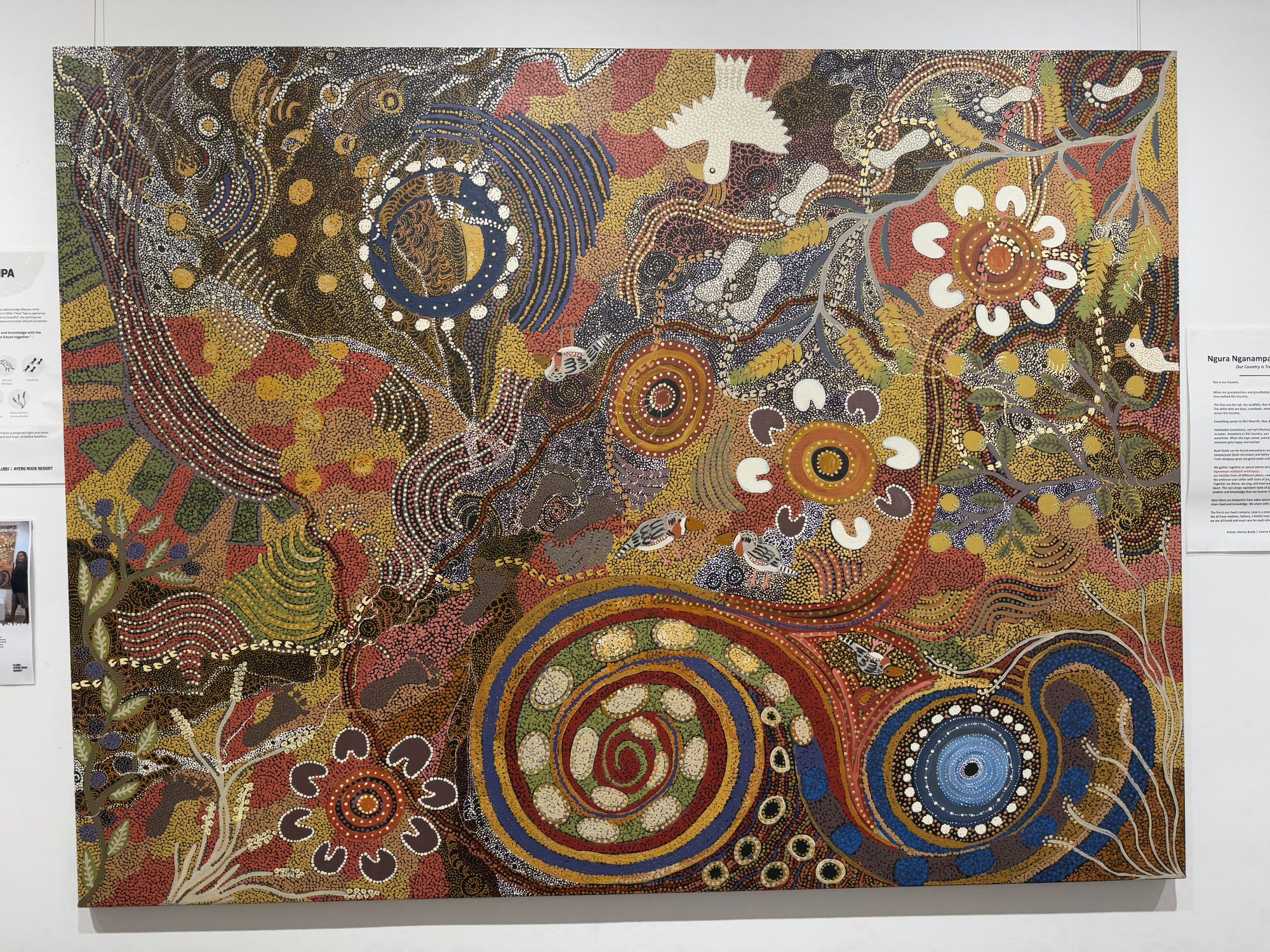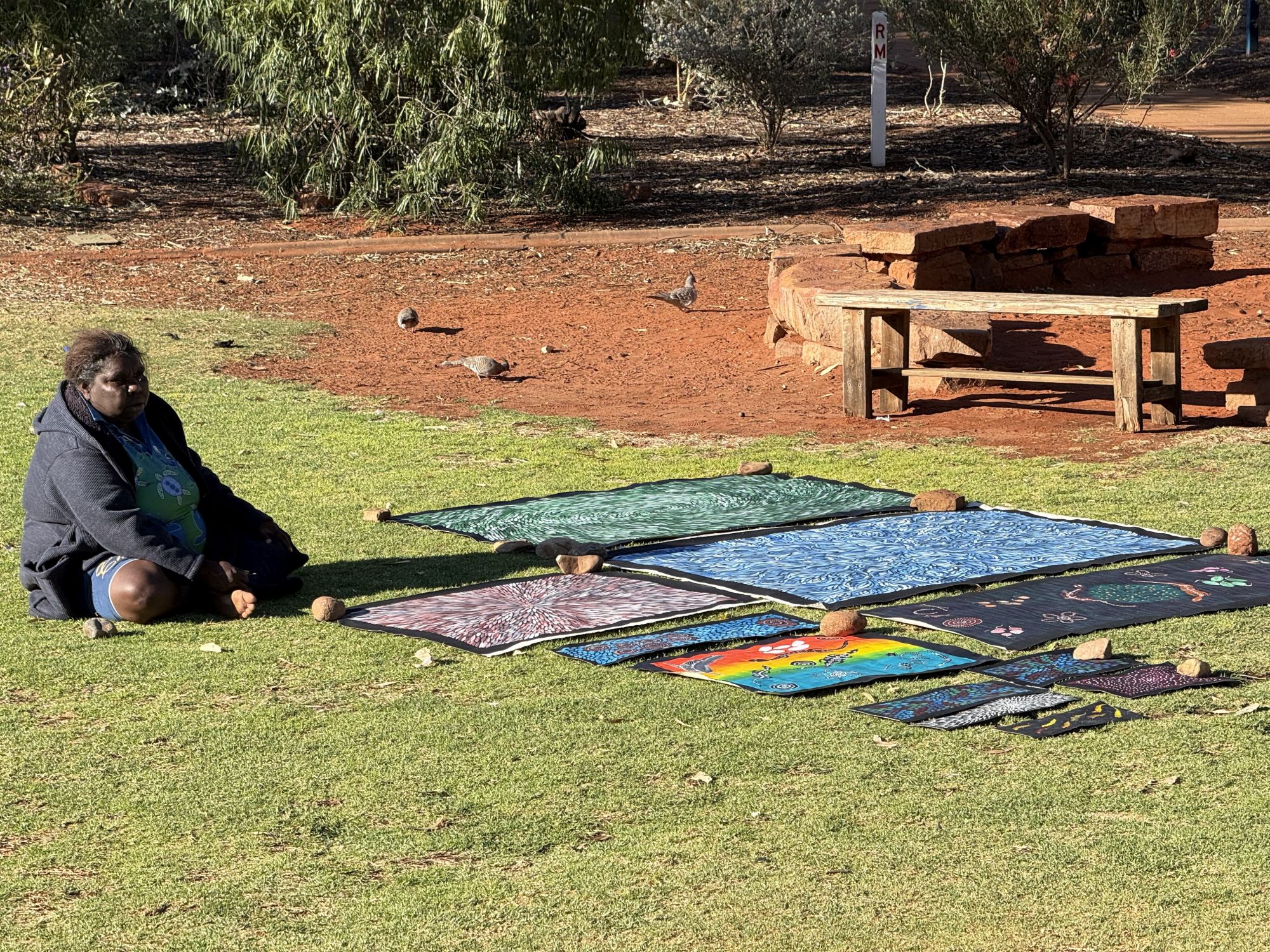 Das Ayers Rock Resort, das den Berg erschließt, wurde in respektvoller Entfernung erbaut, so dass nichts den Eindruck stört. Es besteht aus einer Ringstraße an deren Außenseite mehrere Hotels verschiedenster Preislagen (auch für Backpacker), der Campingplatz, ein kleines Ladenzentrum, Polizeistation, Krankenstation und eine Tankstelle angeordnet sind. Die Mitte wurde freigelassen. Auf der Ringstraße verkehrt ein kostenloser Shuttlebus. Den nehmen wir an einem Nachmittag, um uns die Läden und zwei Galerien anzuschauen. Dafür bleiben und gerade zehn Minuten denn um fünf macht alles zu. Man legt hier Wert auf Work Life Balance. Nur auf der Grasfläche im Ladenzentrum ist noch Betrieb. Hier gibt es täglich ab 16:00 einen Aborigine Open Air Kunstverkauf. Die Frauen sitzen am Boden, vor sich ihre an den Ecken mit Steinen beschwerten Gemälde. Wortkarg, uninteressiert und irgendwie überhaupt nicht präsent, genau wie in Alice. Während die Preise in der Galerie bei 3500 $ anfingen, bekommt man hier schon etwas für 500 $, allerdings deutlich laienhafter gemalt. Trotzdem sehen wir, dass mehrere Gemälde gekauft werden.