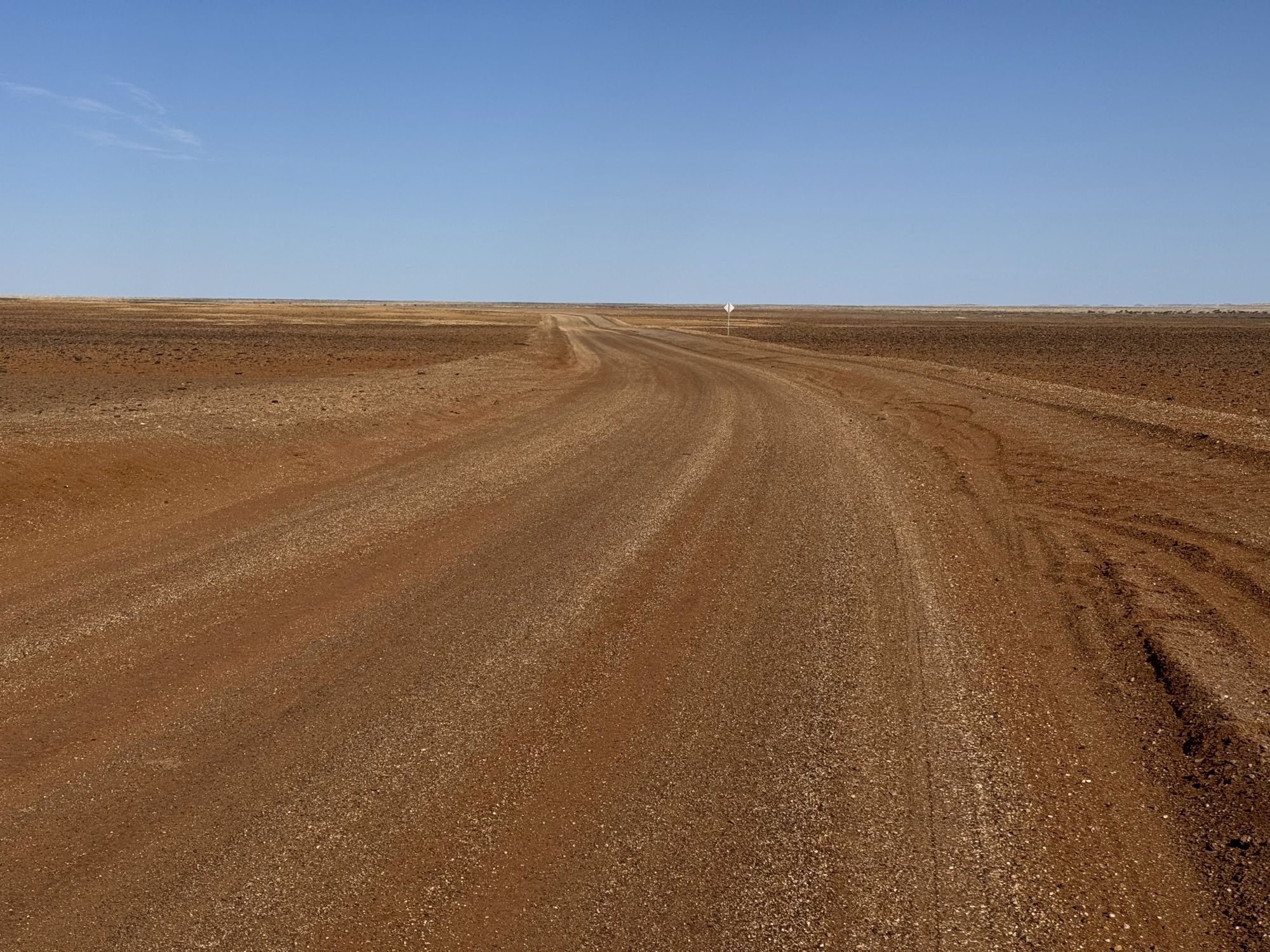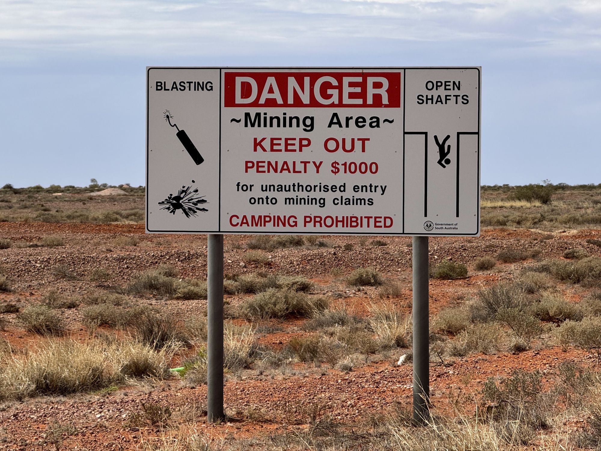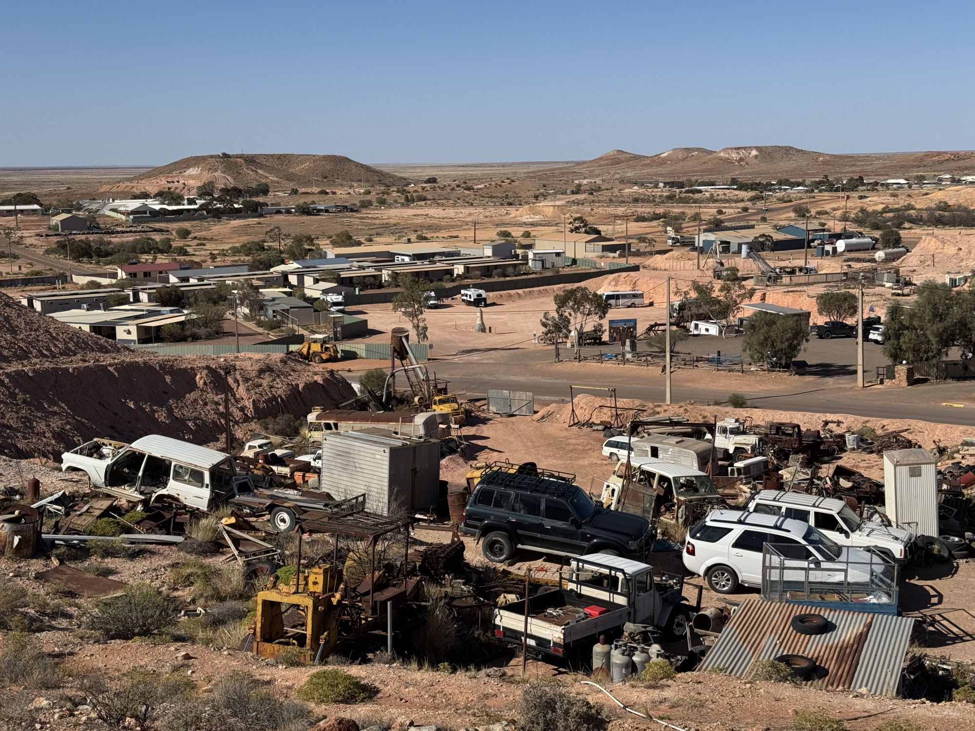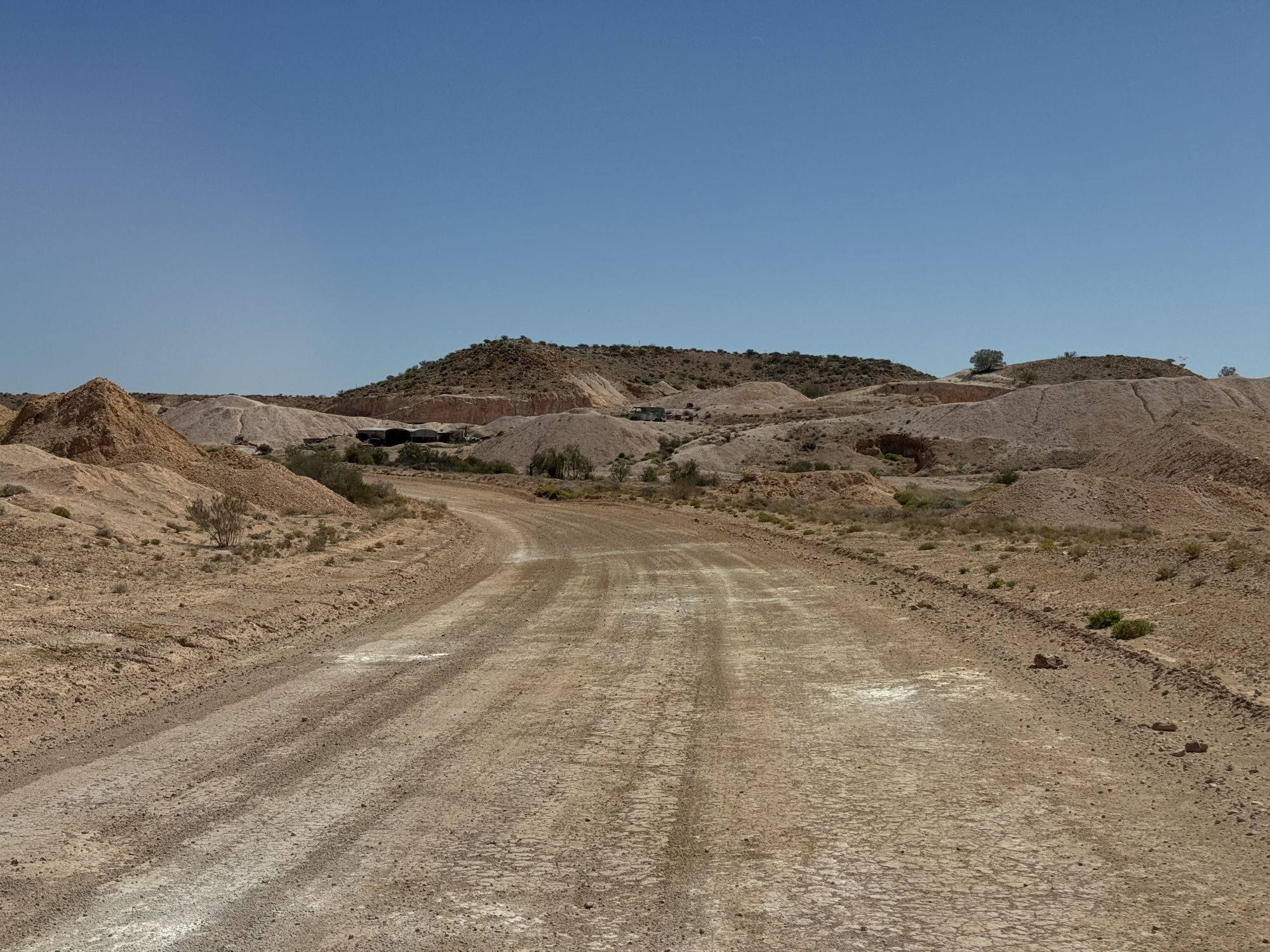 Die Strecke nach Coober Pedy ist sehr eintönig, flach und mit niedrigem Buschwerk bewachsen, ab und an sieht man eine Kuh (überfahren oder lebendig). Coober Pedy kündigt sich 50 km vor der Stadt mit kegelförmigen Abraumhalden an, eine absolute Mondlandschaft.