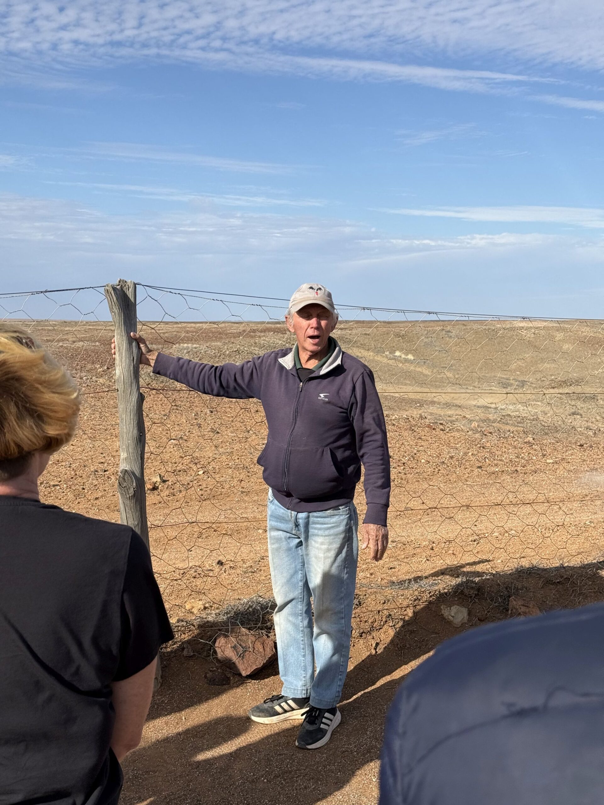 Am Nachmittag unseres ersten Tages in Coober Pedy haben wir die Sunset Tour mit George in den 40 km entfernten Kangu-Breakaways Conservation Park gebucht. Um drei Uhr geht es los, erst in die Moonplains, dann zum Dog Fence und dann zu den Breakaways. George ist ein lustiger Typ, um die 70, australischer Vietnam Veteran (ja, die Australier waren im Vietnam Krieg dabei) und verlangt als ehemaliger Militär Aufmerksamkeit und Gehorsam. Auf sein „Right, you got me“, muss unbedingt mit „Yeah“ geantwortet werden. Erkennt man in den erodierten Bergen keinen Mann, Hund oder Kamel rümpft er die Nase! Ignorante Touristen!