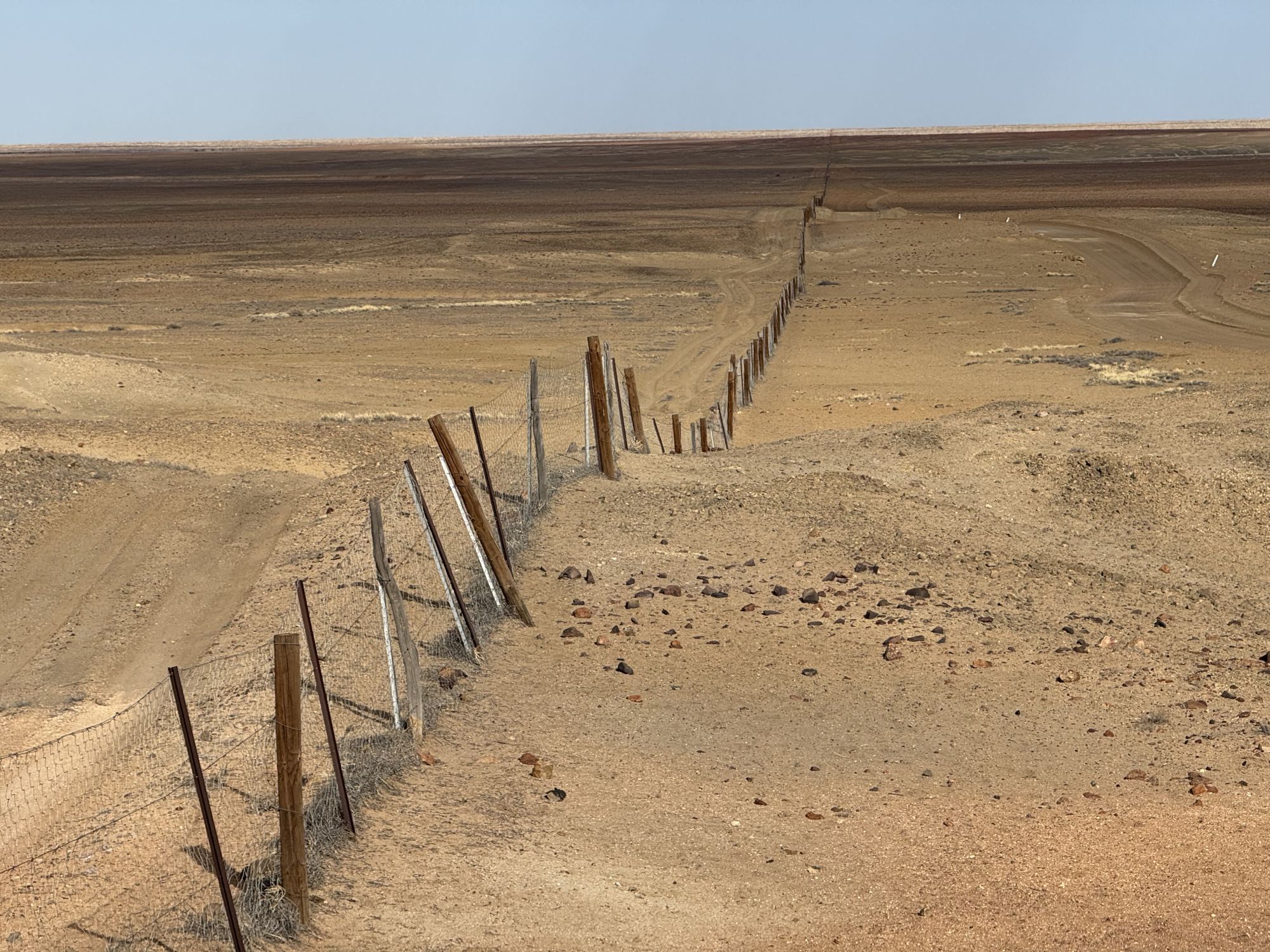 In den Moonplains gibt es versteinerte Bäume, glitzernde Platten aus kristallinem Gips und viele, viele Steine und dann natürlich den berühmten Dog Fence. Für Europäer kein Begriff, obwohl es mit 5300 km Länge der längste Zaun der Welt ist. Der Zaun wird heute noch instandgehalten, ist 2 m hoch und schützt die Gebiete südlich davon vor den Dingos, den wilden Hunden Australiens. Dingos sind anscheinend auf Schafe spezialisiert und richten in den Herden einen riesigen Schaden an. Die Rinderhaltung nördlich des Zauns ist anscheinend weniger durch sie gefährdet.