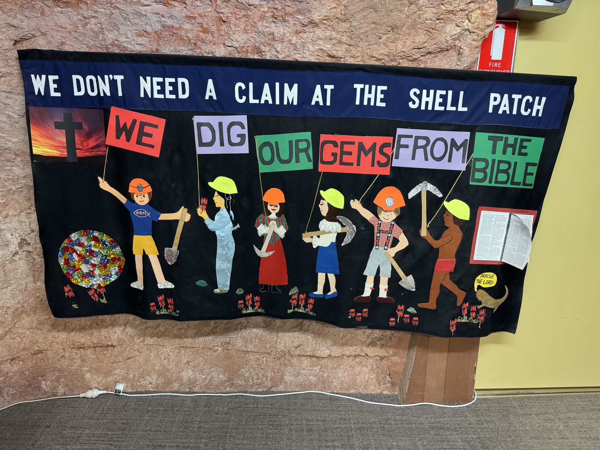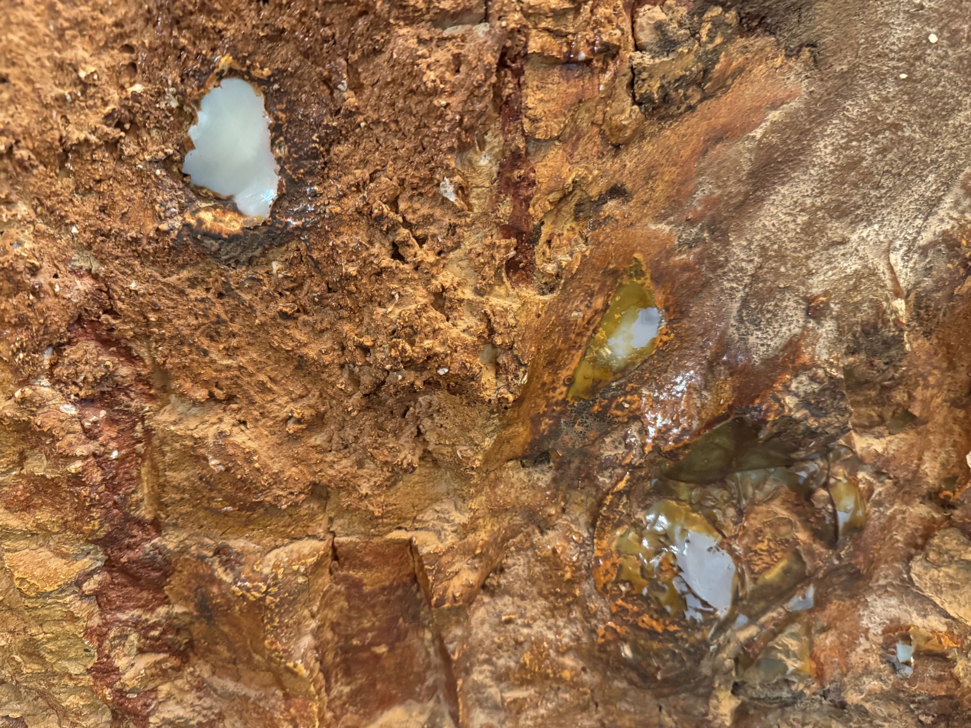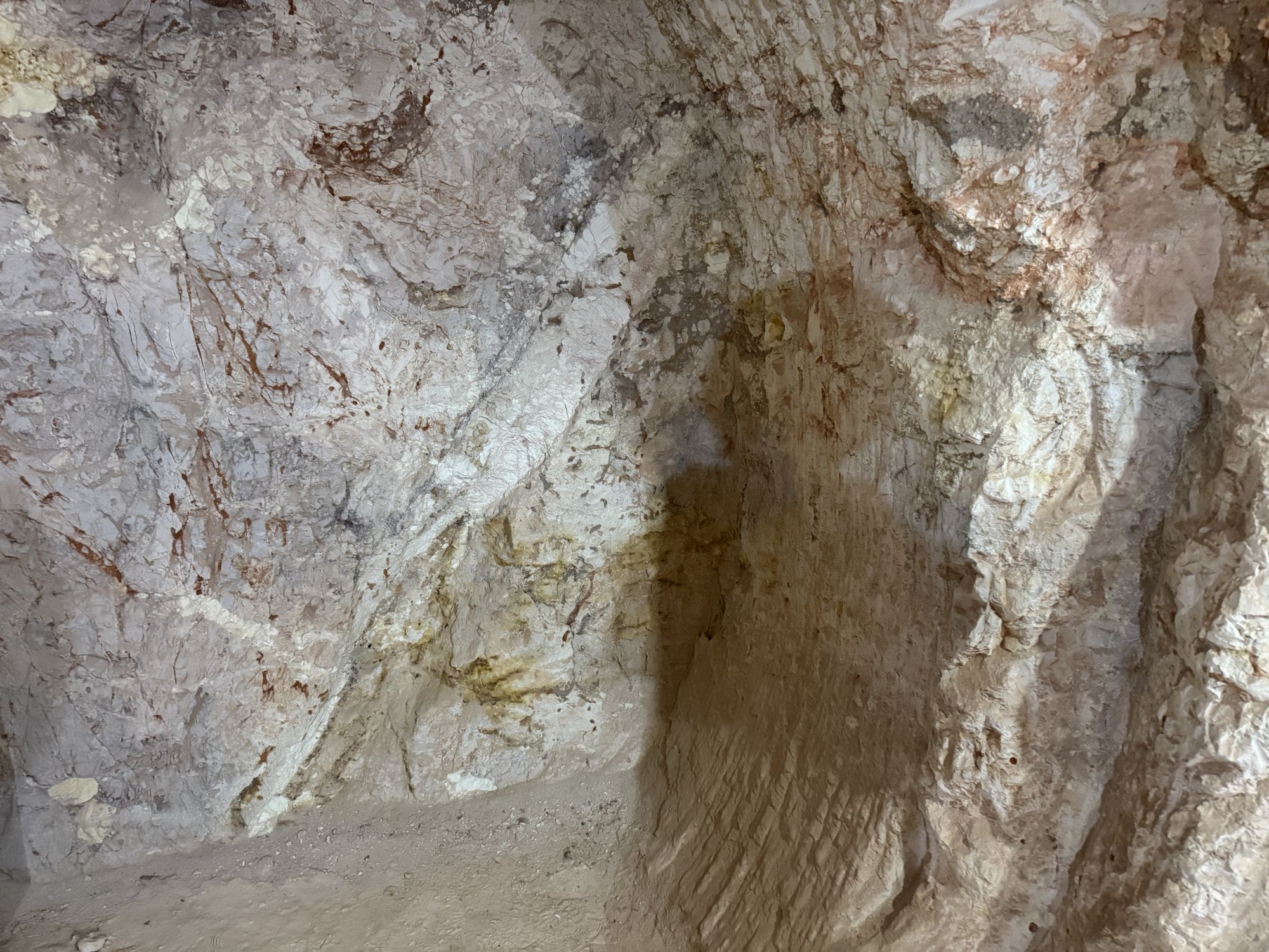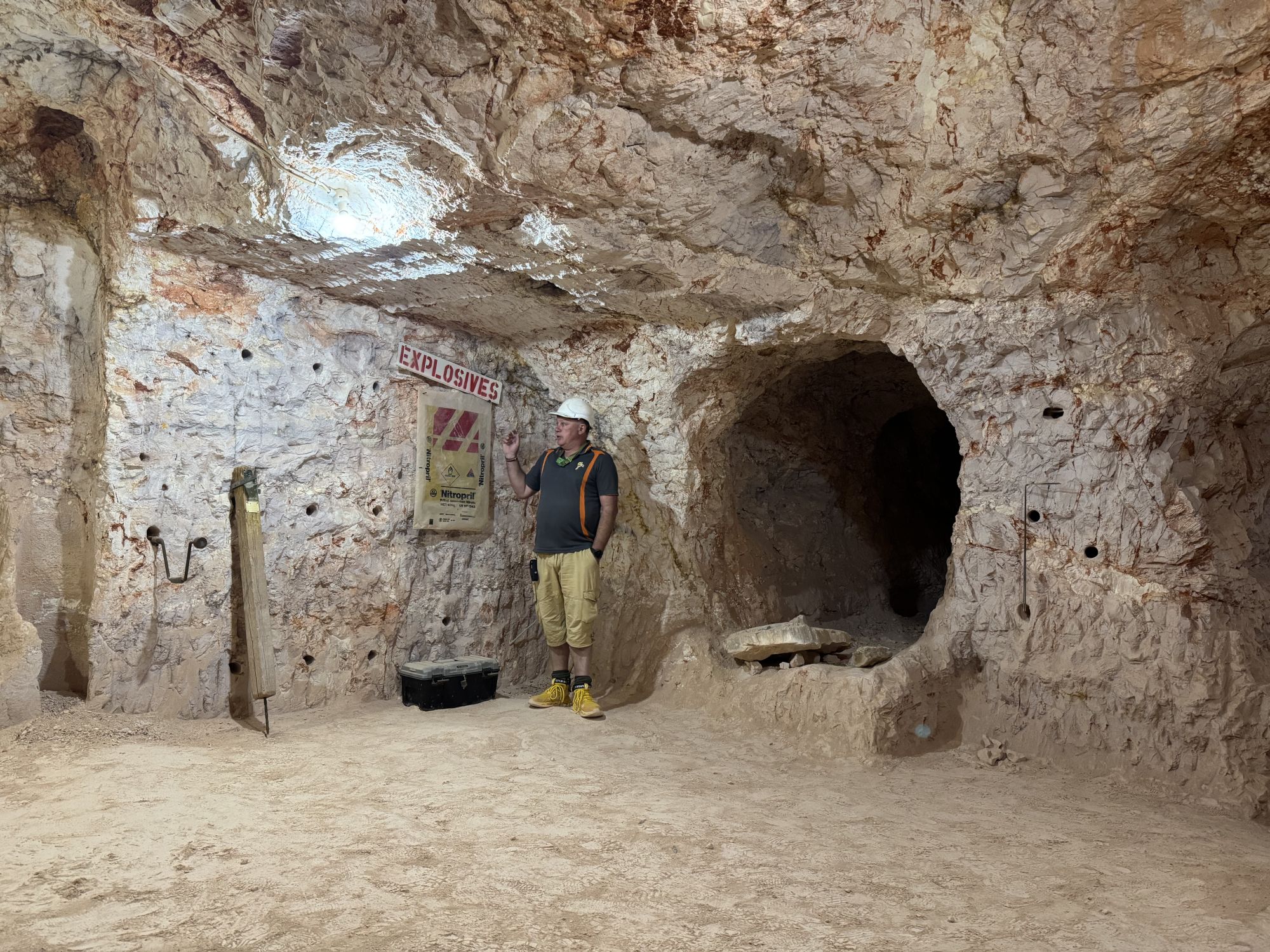 Am Abend machen wir die sehr interessante Minenführung. Die siebenjährige Tochter des Besitzers (mit pinkfarbenem Helm) fungiert als Safety Officer, verteilt die Helme und zieht sich dann in das neben der Mine gelegene unterirdische Heim zurück. Ihr Vater ist seit 18 Jahren Miner und betreibt nebenher seinen Campingplatz. Er hält einen fast zweistündigen hochinteressanten und perfekt strukturierten Vortrag über die Entstehung von Opalen, die verschiedenen Möglichkeiten des Schürfens und wo man suchen muss. Kurzgefasst: reine Glückssache (einziger Hinweis sind Verwerfungen im Sandstein), gefährlich und teuer (Maschinen, Sprit, Lizenzen). Erwähnenswert ist, dass der Schürfer mit Maschinen das Gestein abbaut (2 m3 pro Stunde), bis er, wenn er Glück hat, den Opal hört. Dann geht es vorsichtig mit der Hand weiter! In den meisten Fällen (über 90%) hat er dann aber nur wertlosen farblosen Opal (Podge) gefunden. Genau der richtige Beruf für Glücksritter!