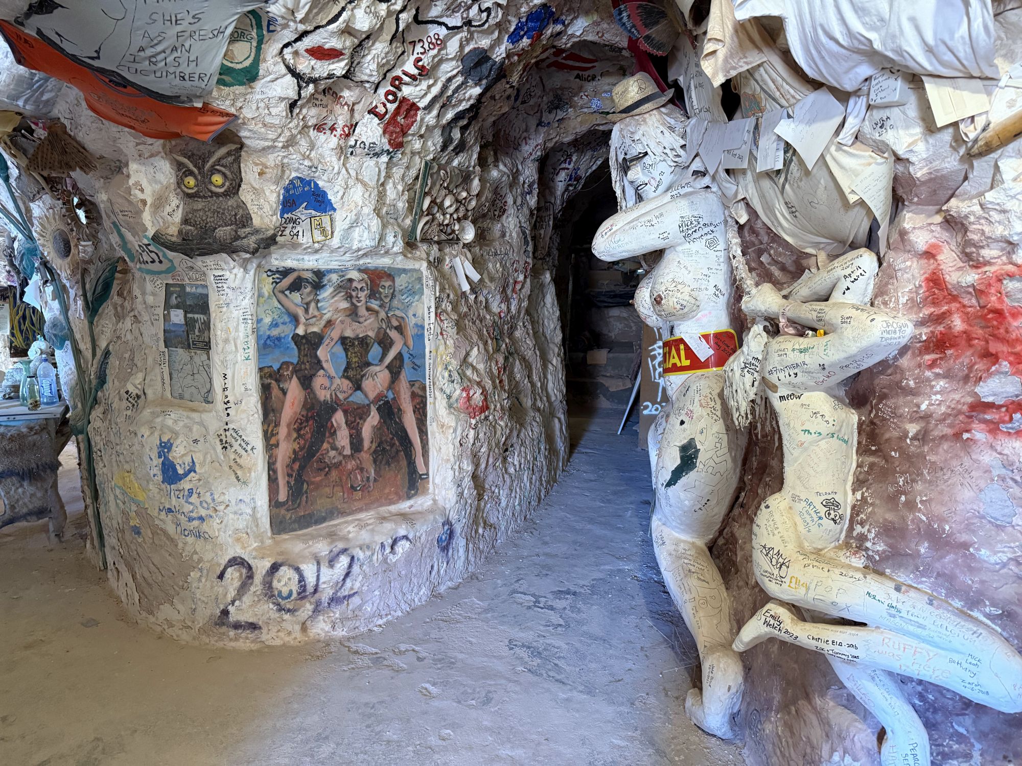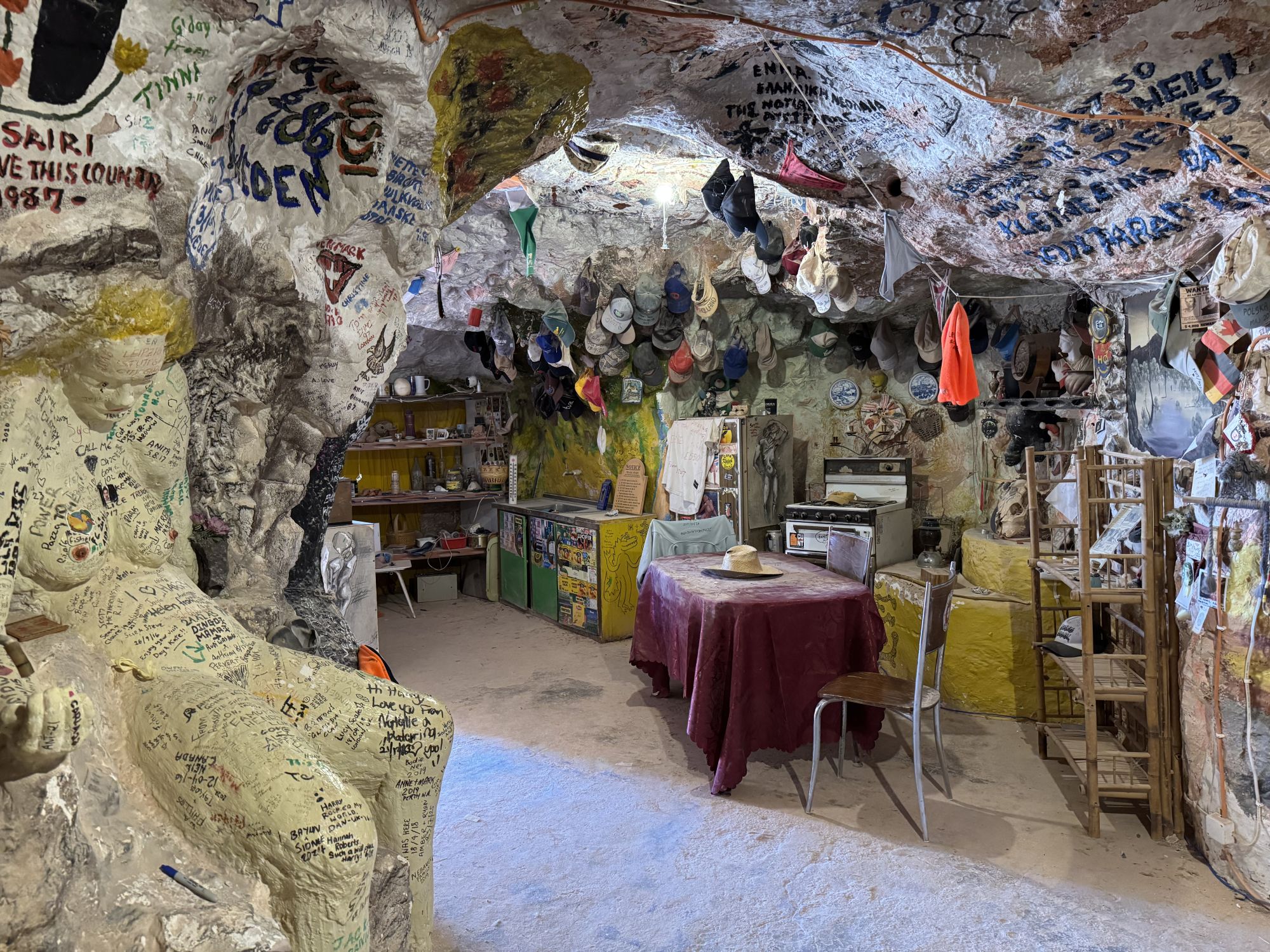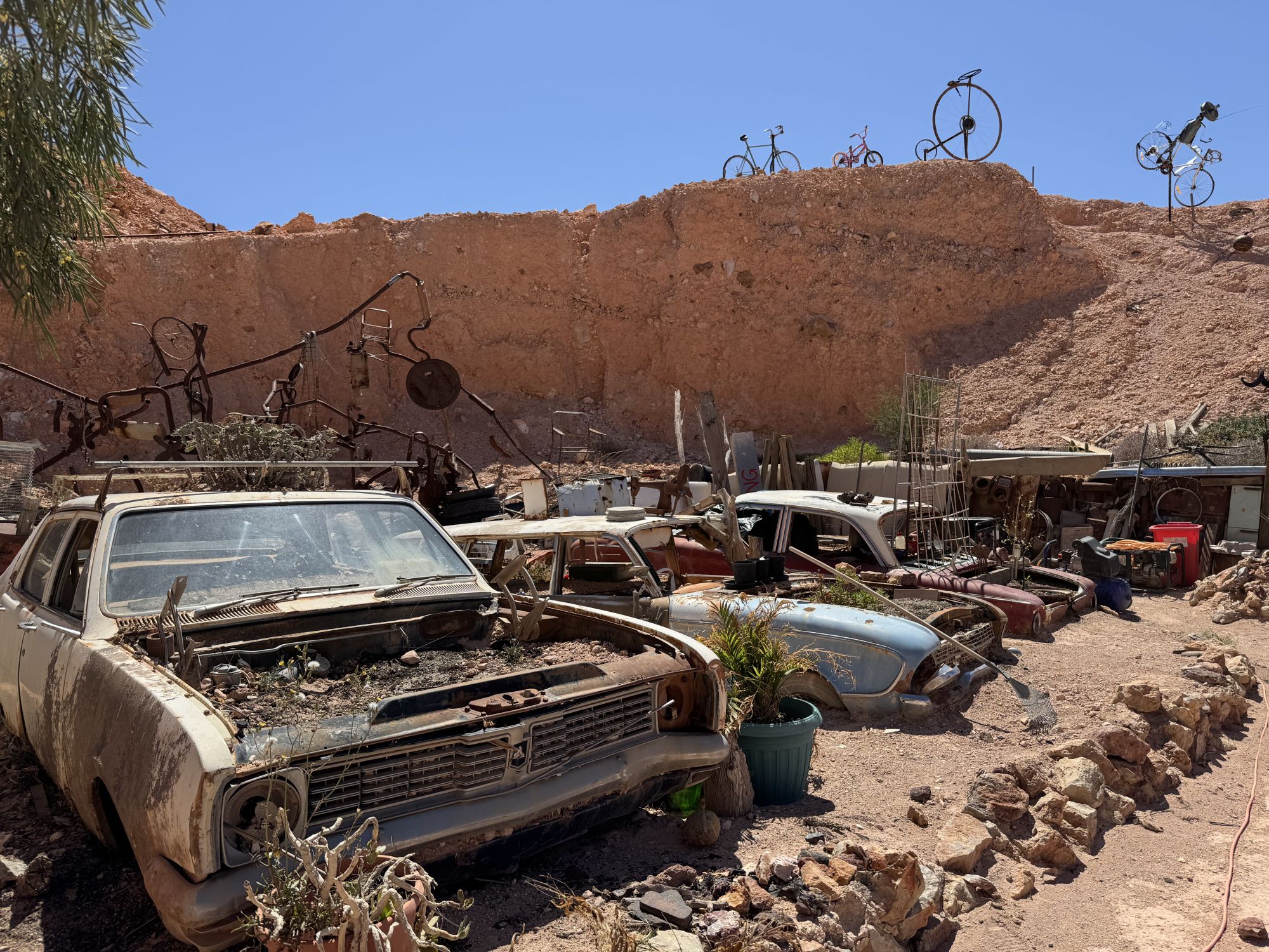 Ein Ausflug zum 4 km entfernten Dugout von Crocodile Harry darf nicht fehlen. Crocodile Harry (1925-2006) hieß eigentlich Arvid Blumenthal und ist aus Lettland nach Australien ausgewandert. Er war ein echter Outback Mann und lebte von der Krokodiljagd in Nord Queensland. Später zog er sich zum Opalschürfen nach Coober Pedy zurück und lebte in eben diesem Dugout. Er muss ein Exzentriker, Sammler skurriler Dinge und großer Geschichtenerzähler gewesen sein. Nach seinem Tod entwickelte sich der Dugout zu einer Attraktion und wurde von allen möglichen Besuchern weiter ausgeschmückt.