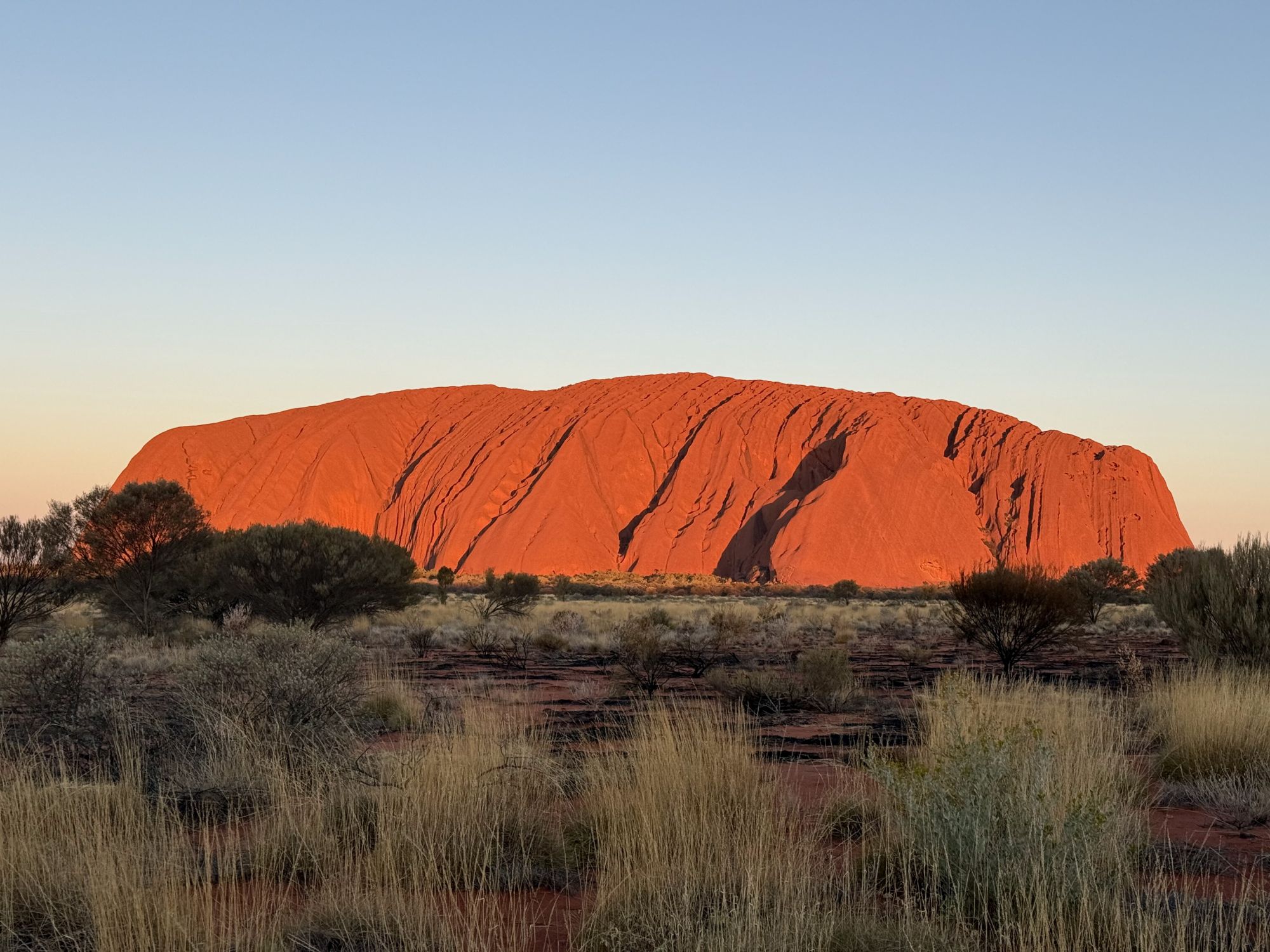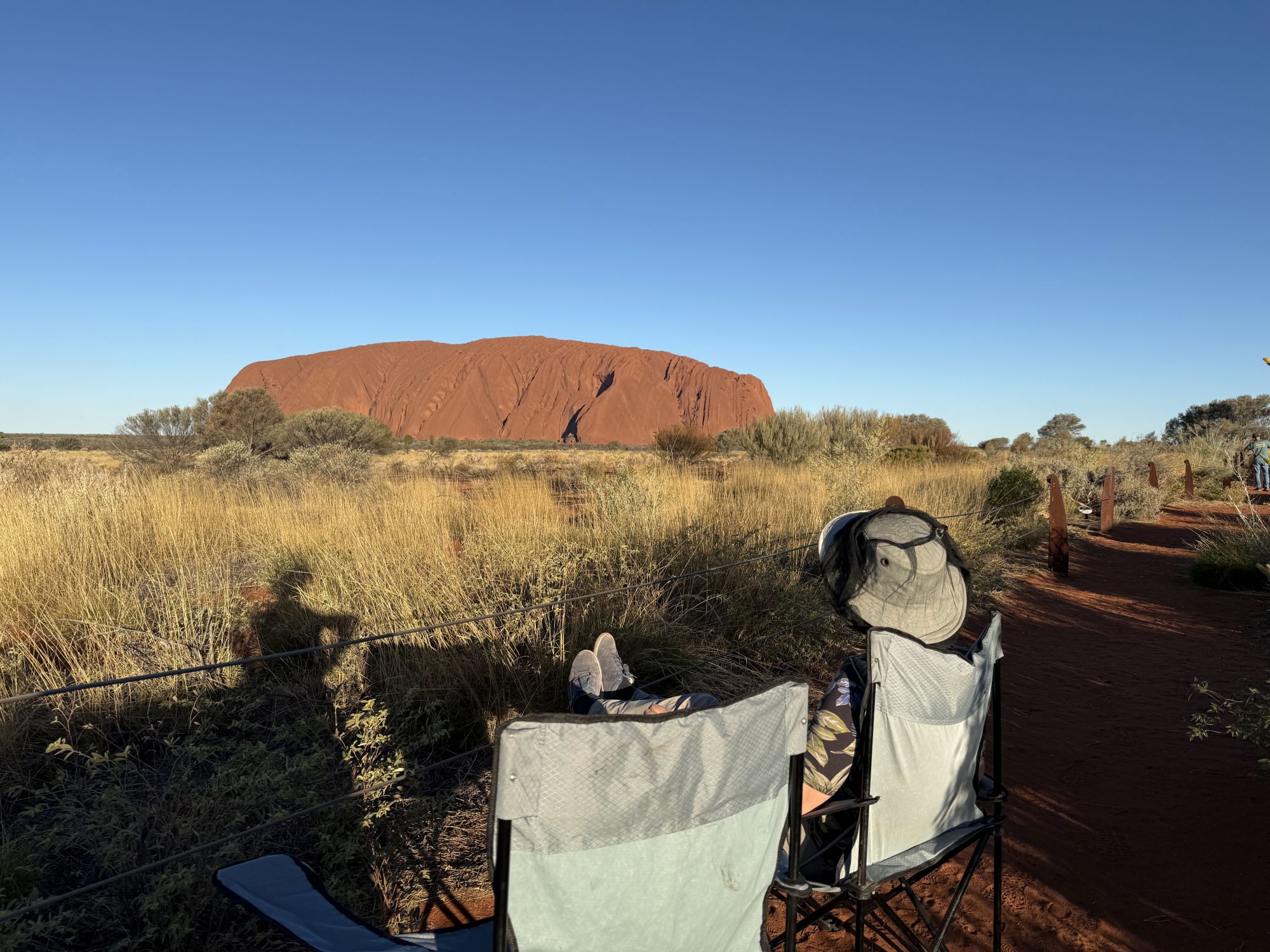 Eine Stunde vor Sonnenuntergang sichern wir uns am Sunset Viewing Point einen schönen Platz und warten auf unseren Klappstühlen mit einem alkoholfreien Bier in der Hand auf das was kommen wird. Der Parkplatz ist groß, aber so gebaut, dass jedes Auto Blick auf den Berg hat. Manche Leute sitzen auf ihren Autodächern, manche im Auto (wegen der Fliegen) und manche spazieren den Weg entlang. Die Stimmung ist jedenfalls bestens! Dann beginnt Uluru zu glühen…