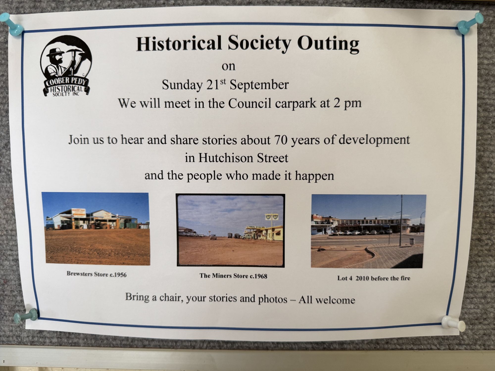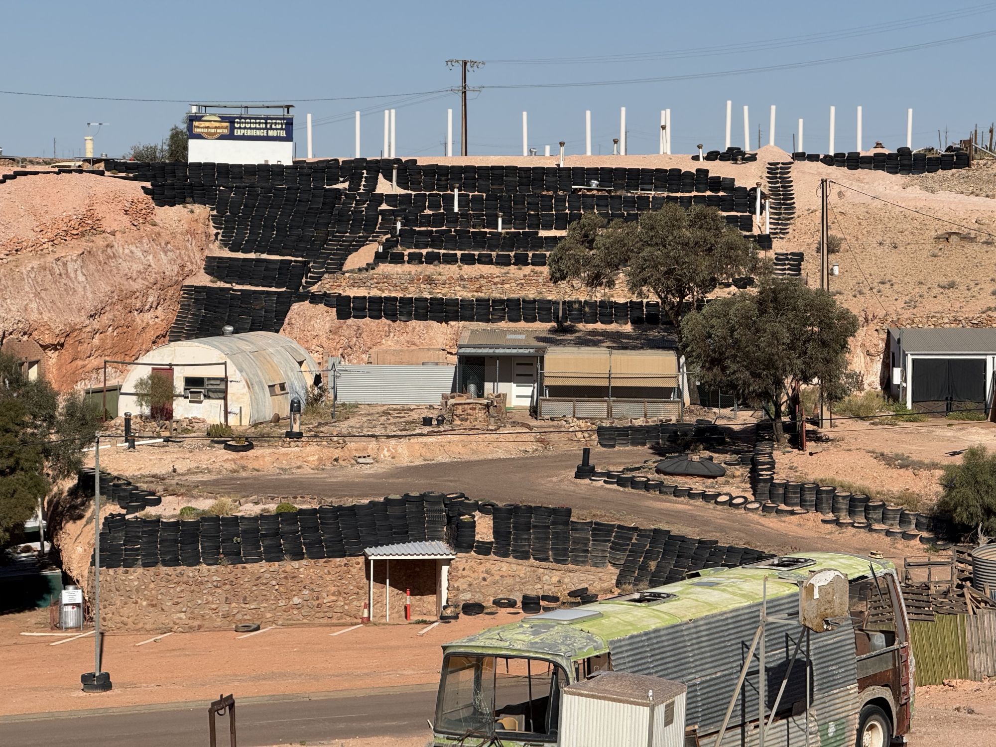 Am nächsten Tag schauen wir uns die Sehenswürdigkeiten der Stadt an. Da Coober Pedy die einzige Ansiedlung weit und bereit ist, bietet die Stadt alles, was man so braucht. Ein Krankenhaus mit 24 Betten, einen Flugplatz, das letzte Autokino Australiens, einen sehr gut sortierten Supermarkt, einen Liquor Store, ein sehr schönes Schulzentrum mit Swimming-Pool und ein reichhaltiges Soziallleben. Es gibt einen kroatischen, italienischen und einen griechischen Club, einen Golfplatz, eine Shooting Range, einen Pferde- und einen Autorennplatz, eine Historical Society und drei Kirchen (alle unterirdisch). Darüber kann man als Bewohner offensichtlich vergessen, dass die Stadt katastrophal aussieht. Um die Häuser/Höhlenwohnungen liegt aller Schrott und die Altreifen der letzten 80 Jahre. Aber in dieser Einöde ist das einfacher als eine gezielte Entsorgung und man hat auch immer Ersatzteile auf Lager!